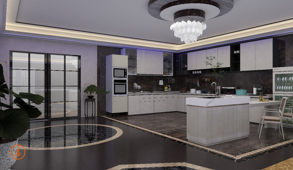 الإضاءة أيضًا عنصر أساسي في المطبخ الحديث، حيث يتم توزيعها بشكل متوازن بين الإضاءة المخفية داخل الخزائن والإضاءة الرئيسية، وهو ما يمكن معاينته بشكل واقعي داخل التصميم الافتراضي. كما يمكن إضافة لمسات ديكورية بسيطة مثل النباتات أو الرفوف المفتوحة لتمنح المطبخ حيوية وجاذبية أكبر.
